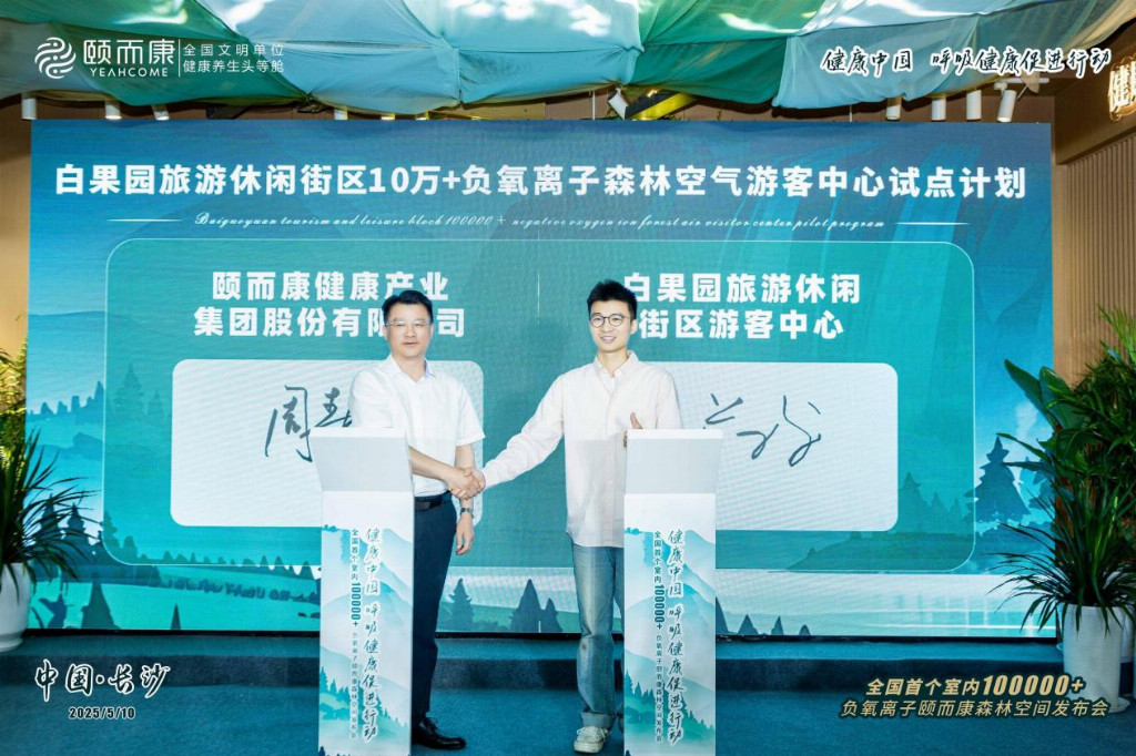 随后,颐而康与白果园旅游休闲街区游客中心签约,宣布将共同推进白果园旅游休闲街区10万+负氧离子森林空气游客中心试点建设。