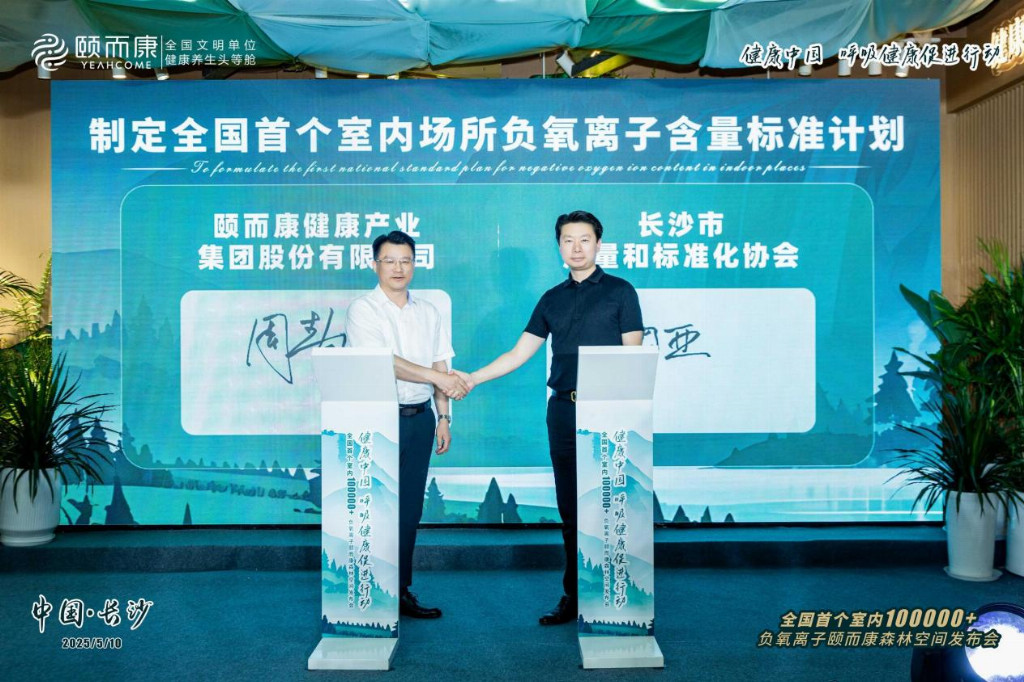 (颐而康与长沙市质量和标准化协会在发布会上签约共同推动制定全国首个室内场所负氧离子含量标准)